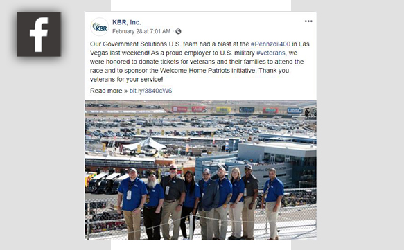 KBR recently partnered with the Welcome Home Patriots Initiative, sponsoring 100 U.S. military veterans and their families to attend the NASCAR Pennzoil 400 in Las Vegas, Nevada. KBR created a VIP experience that was hosted by employees who are military veterans themselves.