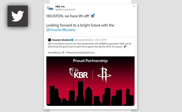 KBR announced a new paid partnership with the Houston Rockets during the 2019–2020 NBA season. In addition to a pregame marketing promotion, this partnership takes place on social media as part of the team’s online Throwback Thursday campaign.